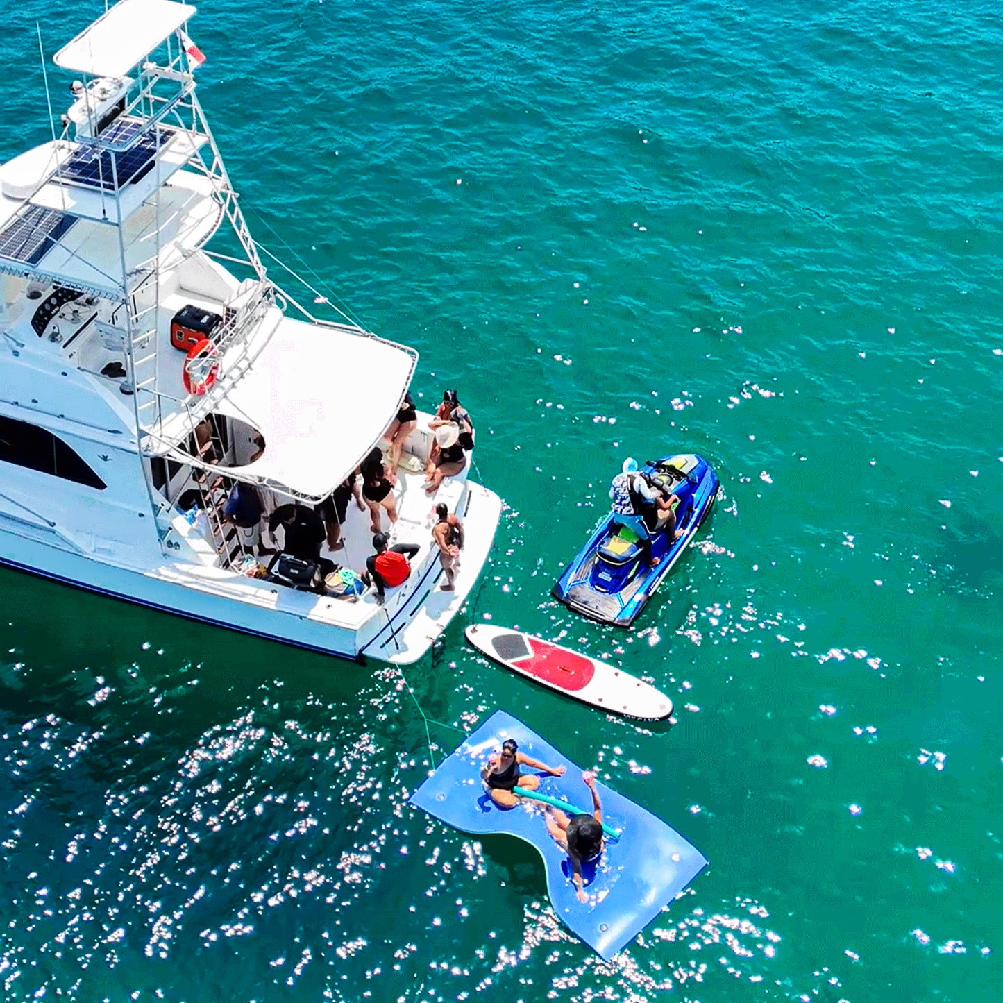 El Rapport 47’ incluye actividades acuáticas como flotadores, stand up paddle y kayak, además de equipo de BBQ y música para crear el mejor ambiente. Con capitán, marino y todos los gastos portuarios incluidos, vas a vivir una experiencia sin preocupaciones.